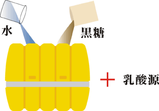 黒糖と水>オリジナル乳酸源・原材料の調合>醗酵・熟成>充填・梱包出荷