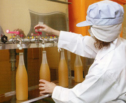 出来上がった乳酸酵素は、三ヵ月の醗酵培養のあとさらに三ヵ月から一年の熟成期間を経て、もう一度社内検査を受け、充填室で一本一本丁寧に充填されます。ここではクラシック音楽はもとより、空調管理や清潔であるための清掃と服装、そしてできるだけ機械を使わず「菌にやさしく」「人の手で」というポリシーからボトリングやラベル貼り、そして梱包などの作業をできるだけ手作業で行うようにしています。