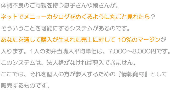 | ※契約から販売に至る行程の「案内書」をダウンロードできます。 <案内書の内容> ・A社との契約締結方法 ・ヘルシーお弁当ウェブ販売システムの見本ページURL ・試食お弁当の注文方法 |