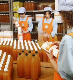出来上がった乳酸酵素は、三ヵ月の醗酵培養のあとさらに三ヵ月から一年の熟成期間を経て、もう一度社内検査を受け、充填室で一本一本丁寧に充填されます。ここではクラシック音楽はもとより、空調管理や清潔であるための清掃と服装、そしてできるだけ機械を使わず「菌にやさしく」「人の手で」というポリシーからボトリングやラベル貼り、そして梱包などの作業をできるだけ手作業で行うようにしています。